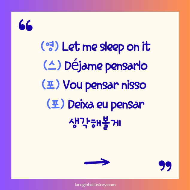 | 1️⃣ Let me sleep on it and I’ll tell you tomorrow. | Déjame pensarlo y te digo mañana. | 생각해보고 내일 말해줄게. |