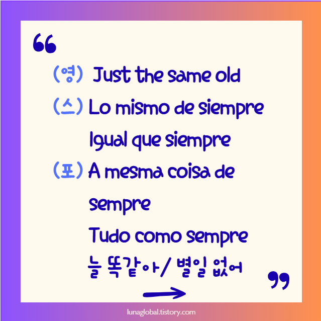 | 5️⃣ Life’s good, just the same old. | Todo bien, igual que siempre. | Tudo bem, a mesma coisa de sempre. | 잘 지내, 늘 그렇지 뭐. |