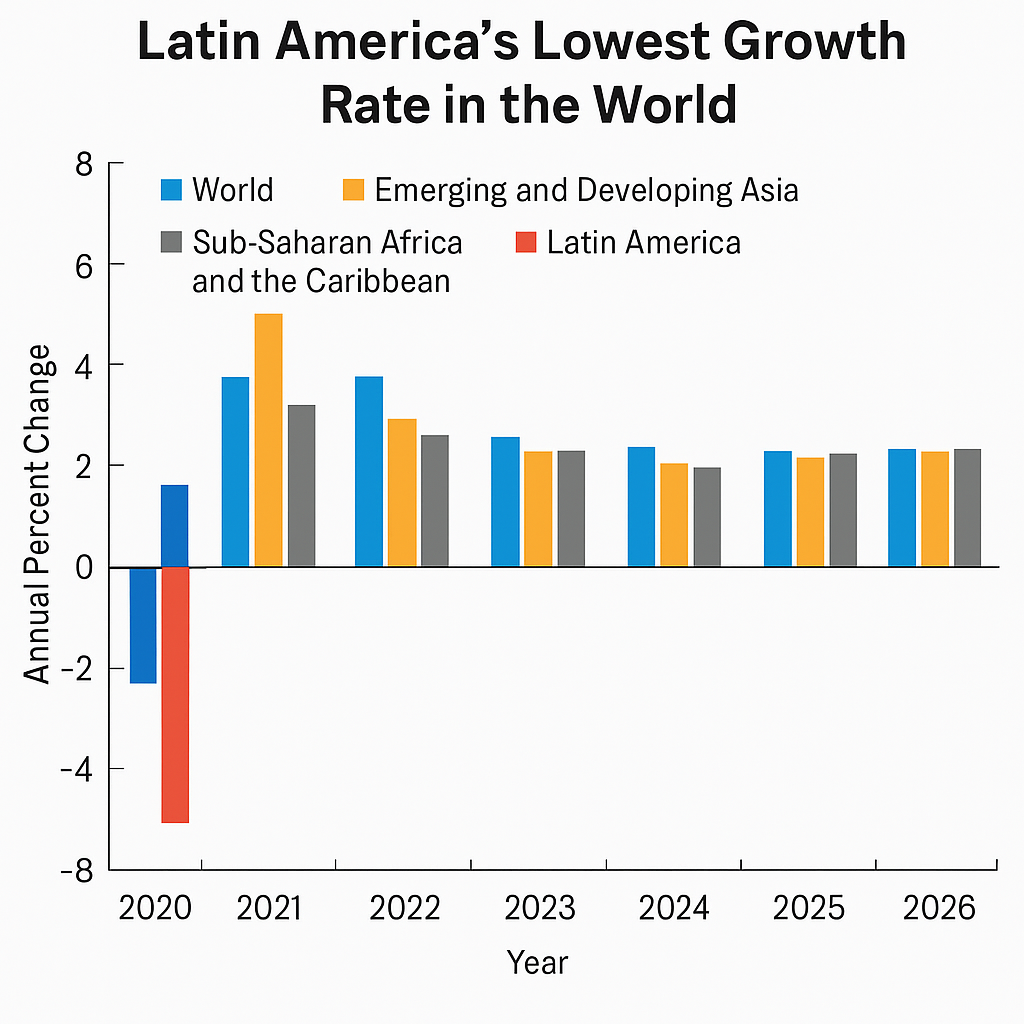 세계은행(2025/10): LAC 성장률 2025년 2.3%, 2026년 2.5%로 소폭 상향했지만 여전히 전 세계 최저 성장 지역으로 규정. 인프라·교육·자본 접근의 제약을 핵심 원인으로 거론.