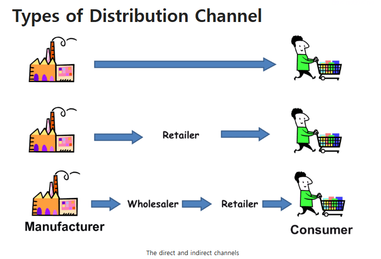 - 도매 / 총판(Distributor): 제조사 → 도매상 → 소매점 → 소비자