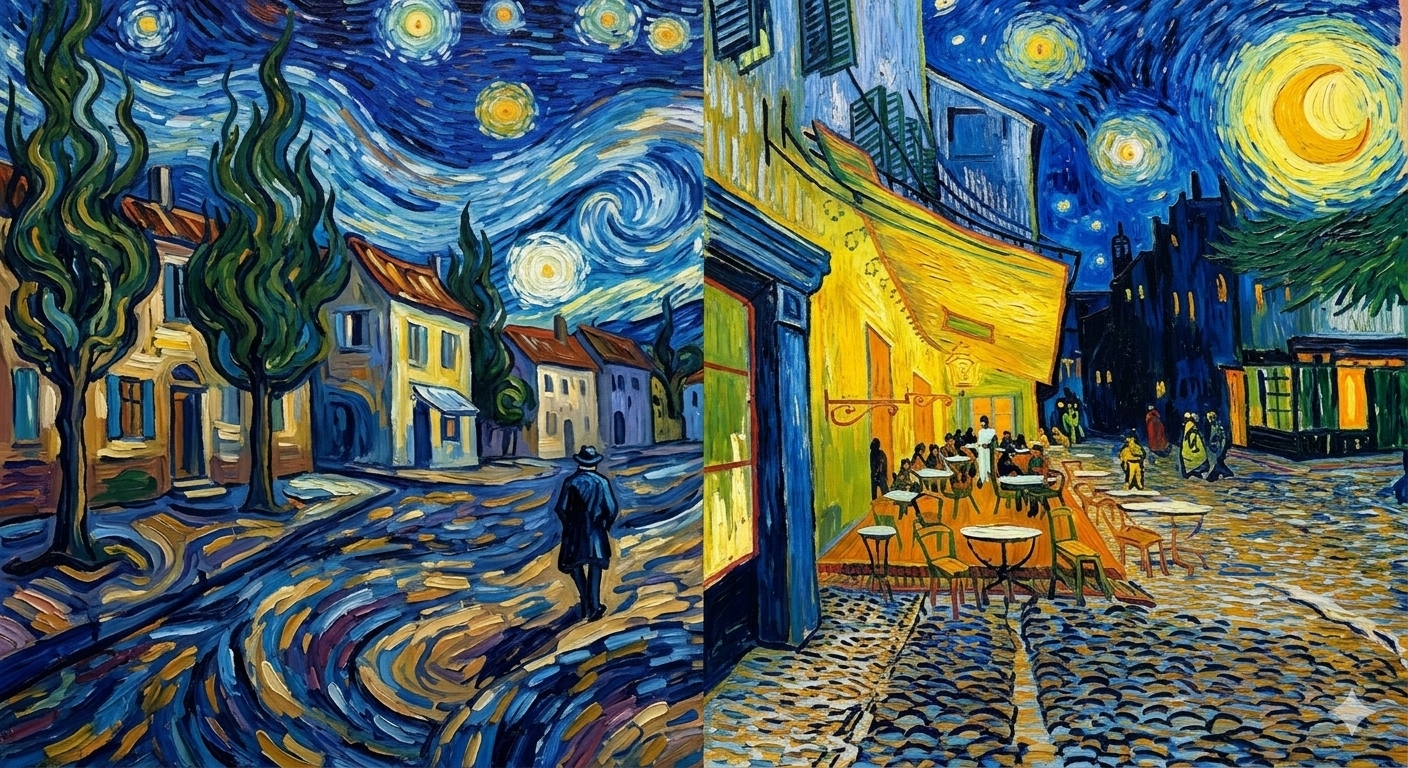 AI는 특정 화가(예: 반 고흐, 피카소)나 예술 사조의 스타일(예: 인상주의, 추상주의)을 학습하여, 새로운 주제를 해당 스타일의 브러시 워크나 색감으로 노이즈에서 재탄생시킵니다.